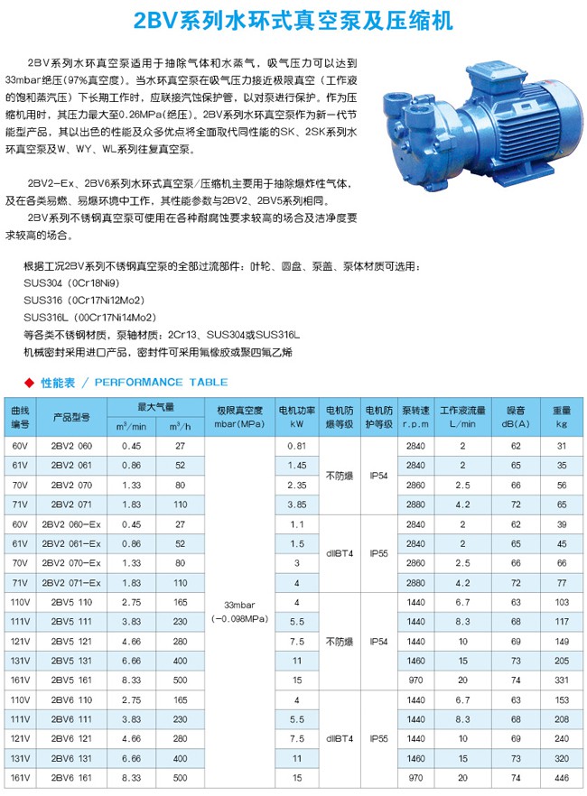 2BV水環(huán)真空泵適用于抽除氣體和水蒸氣,吸氣壓力可以達到33mbar壓力(97%真空度)。當真空泵在吸氣壓力低于80mbar的狀態(tài)下長期工作時,應聯(lián)接氣蝕保護管,以對泵進行保護。如配大氣噴射器,吸氣壓力可達10mbar,噴射器可直接安裝在真空泵上。作為壓縮機用時,其壓力大至0.26MPa。
